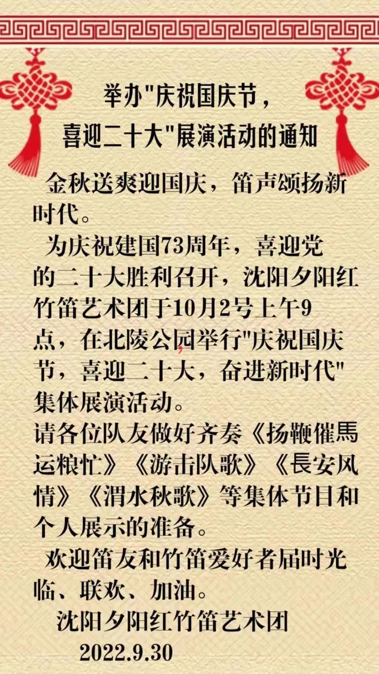 预告|沈阳夕阳红竹笛艺术团“庆国庆、迎二十大”竹笛展演活动 ...