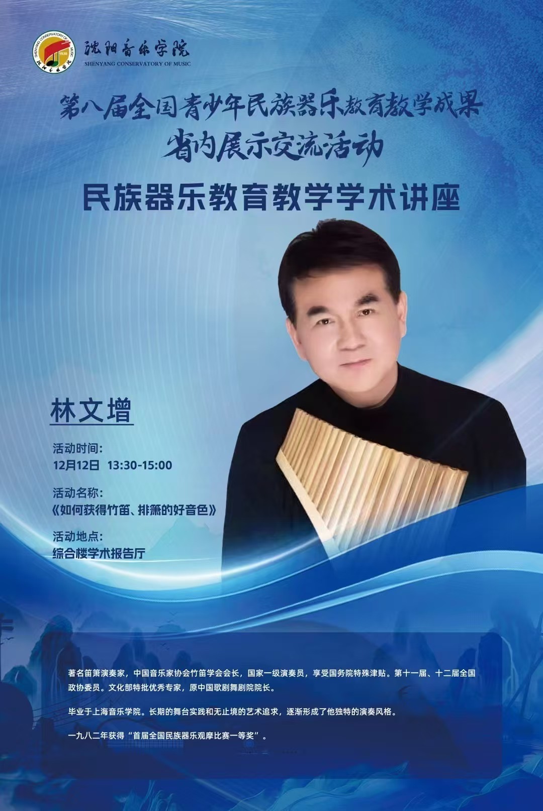 : 沈阳音乐学院第八届全国青少年民族器乐教育教学成果省内展示交流活动——民族器乐教育教学学术讲座:林文增教授《如何获得竹笛、排箫的好音色》讲座于2024年12月12日13:30至15:00在沈阳音乐学院综合楼学术报告厅举行 ...